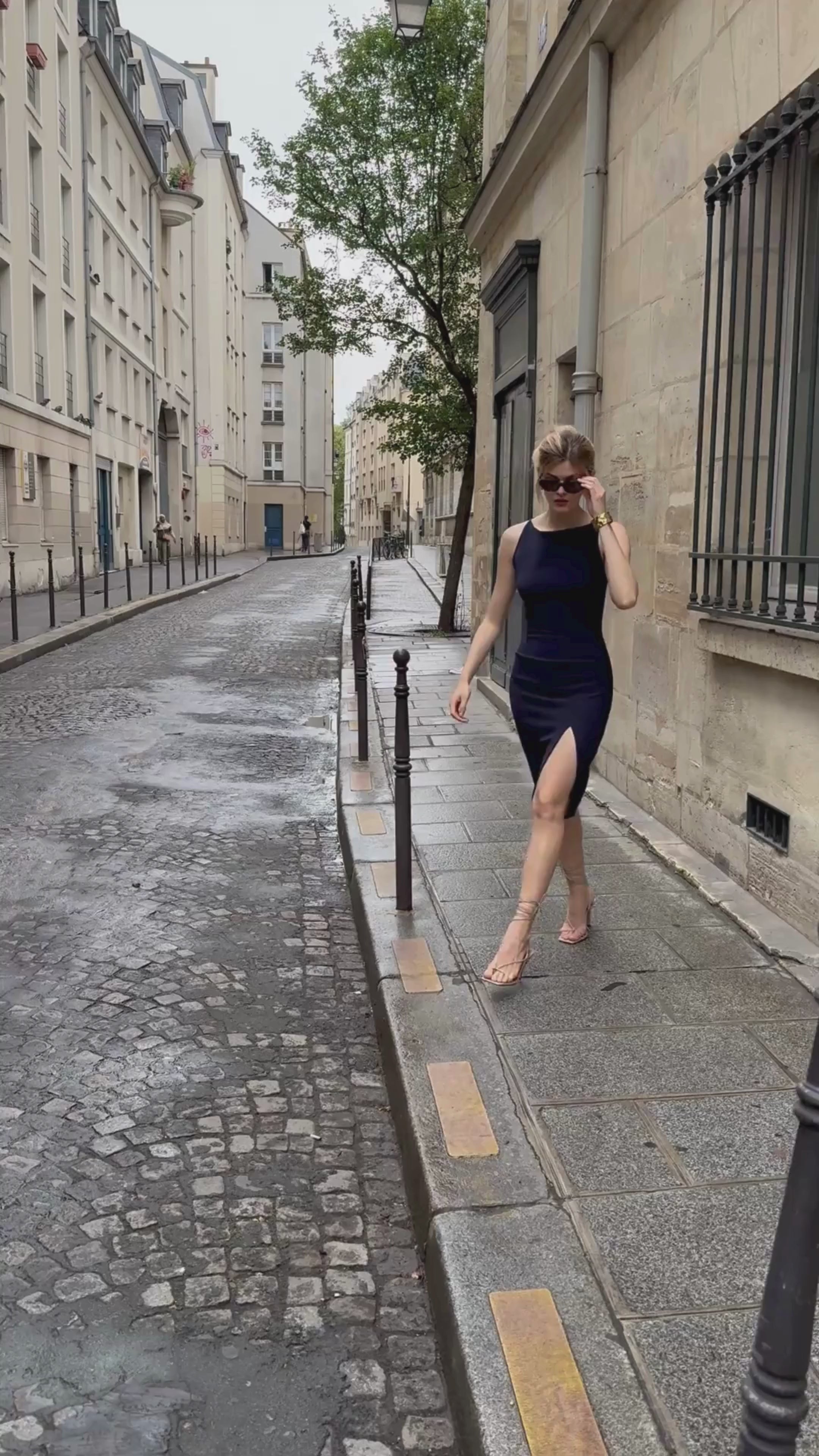• Fitted dress with slit and boat neck