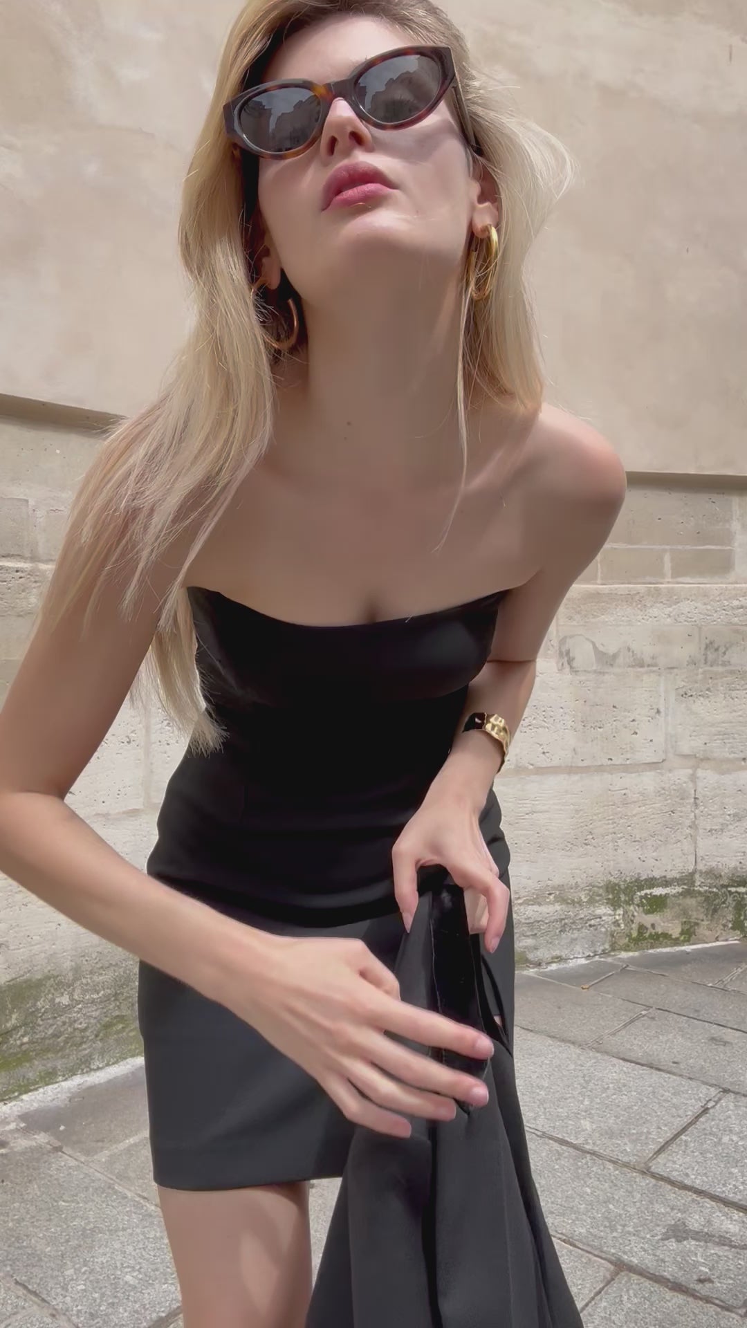 This fitted strapless dress, featuring subtle slits, exudes endless elegance. Pair it with a blazer for a chic look, or bare your shoulders for a bold and sophisticated style.